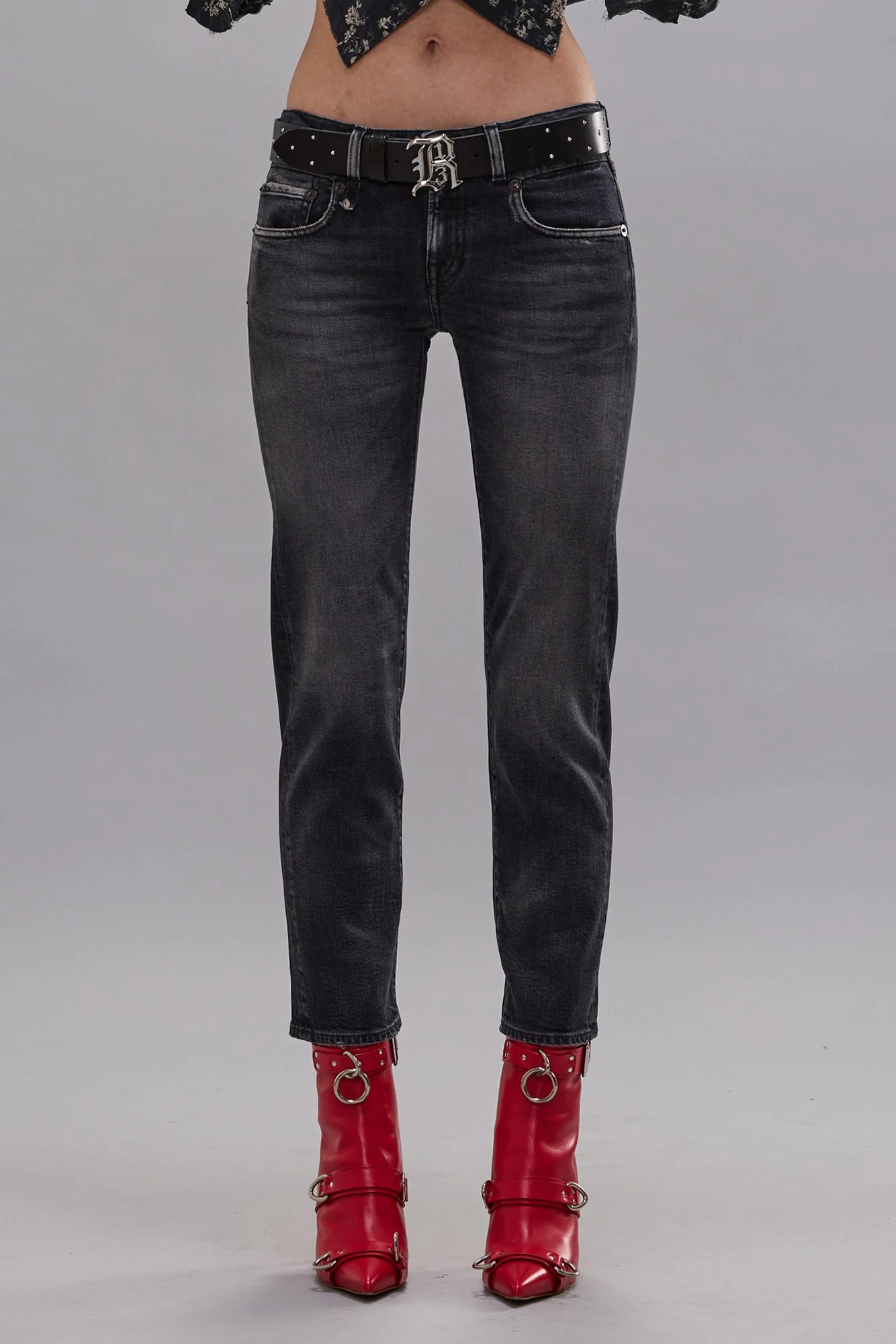 R13's iconic slim fit Boy Straight featuring a low rise and slim straight cropped leg. Built with 12.5 oz black stretch denim and featuring a mid-heavy worn dark black wash with mild grinding throughout local areas.