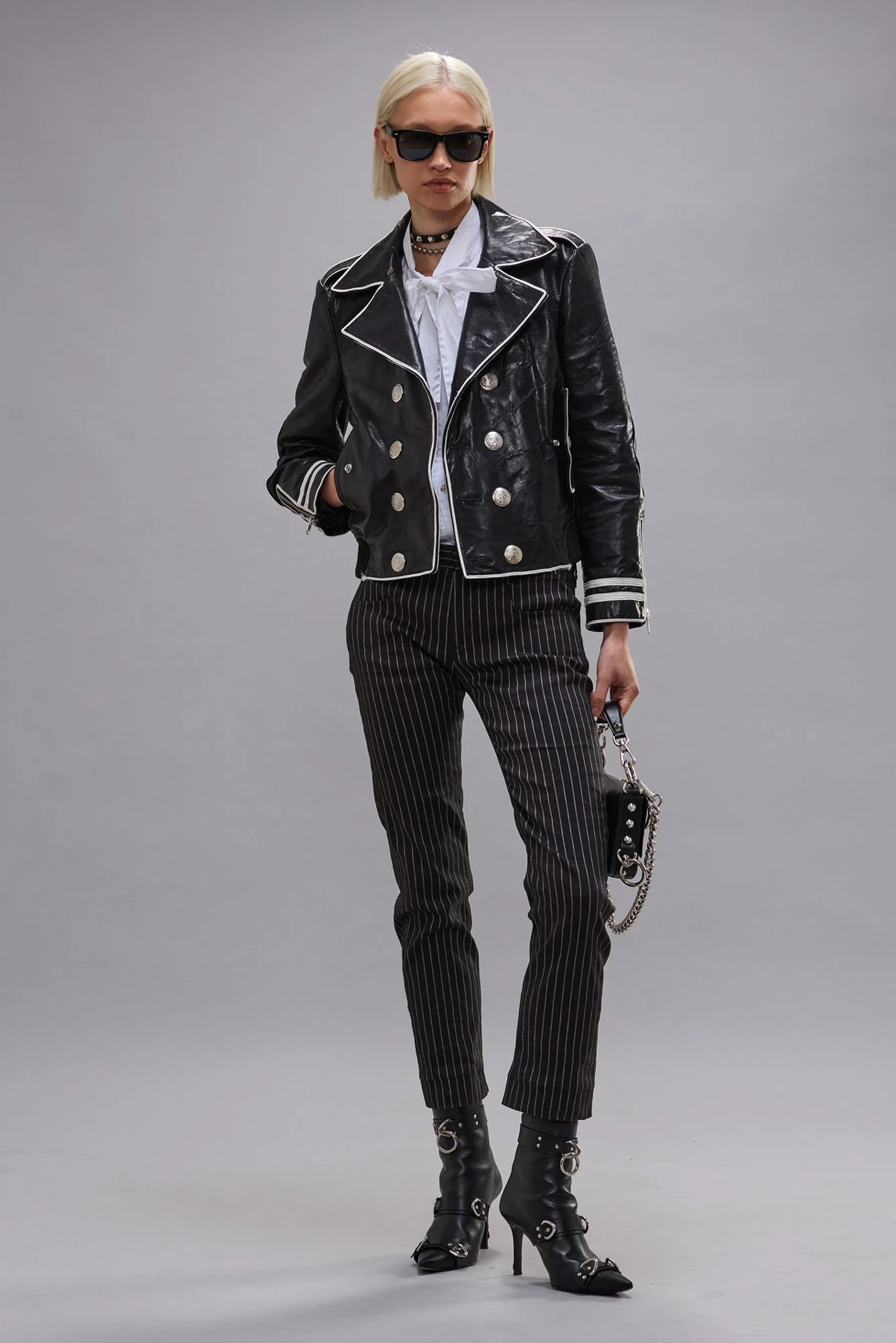 Shrunken leather peacoat with authentic soutache detailing.